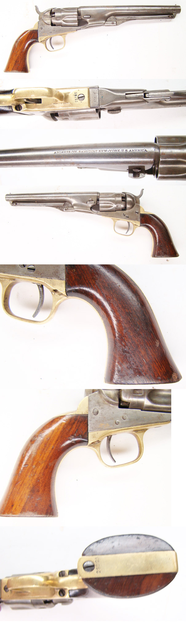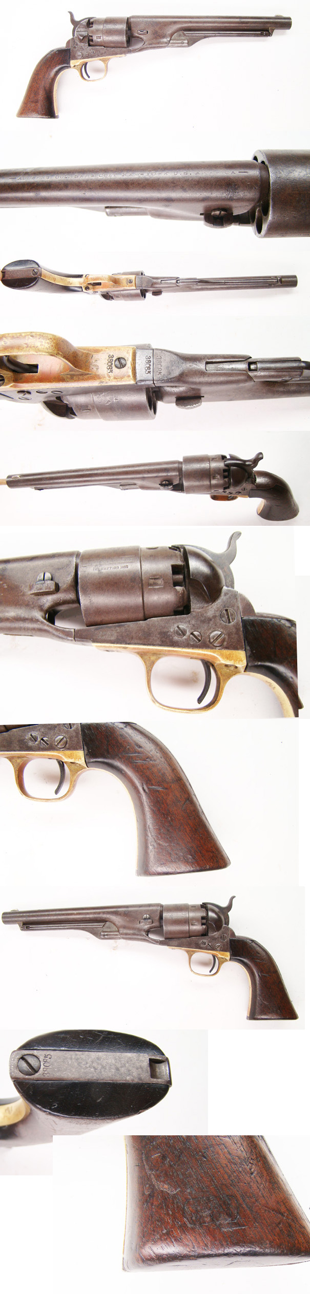 | Colt Model 1860 Army 4 Screw Frame (Civil War) , 44 cal Bore Exc, Mech Exc tight crisp action, Original wood grips near Exc with cartouche and excellent wood to metal fit. Has the original 8”barrel with Exc one line address marking. The frame has the Colts Patent marking on the left side. Serial# 38085 mfg’d 1863 all matching including the wedge. The cylinder has some border engraving remaining and VG patent and serial number. The brass triggerguard has an inspector marking S and has a brass patina finish. Metal overall has a dark aged brown patina finish with some fine pitting in the muzzle area and has a original german silver front sight blade. Has excellent nipples. A fine colt 1860 army Early production ,complete, original and clean Colt 1860 Army |