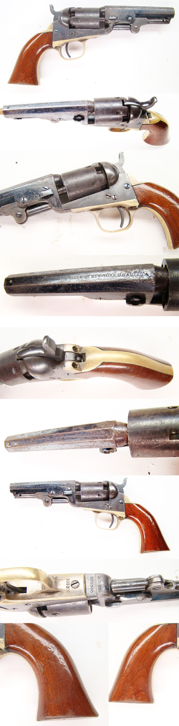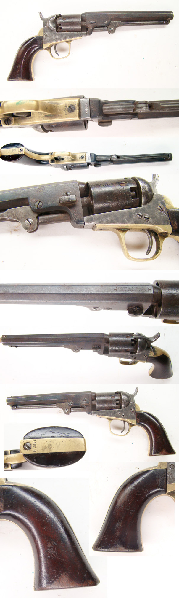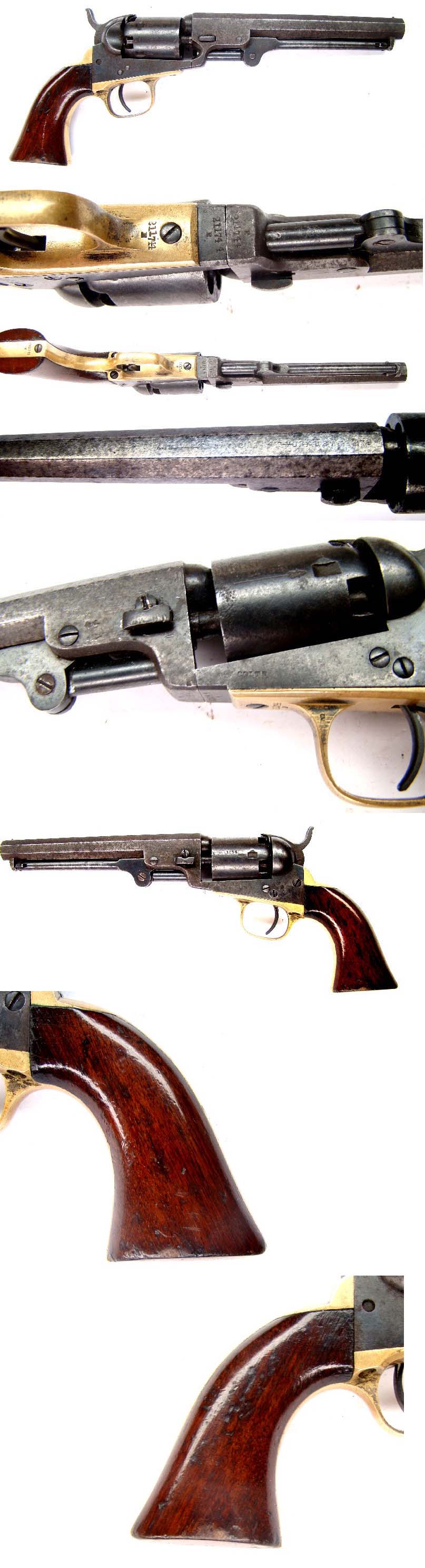 | Colt Model 1862 Police Percussion Pistol 36 cal Bore Exc, Mech Exc, Original wood grips Exc with some original varnish. Has an original 6 ½” Rd barrel with excellent one line colt address marking. The frame has the colts patent marking on the left side partially visible. Has the serial #28225 Mfg’d 1865 all match including the wedge. Metal overall has an aged grey patina finish and the brass backstrap and trigger guard have a patina finish. |