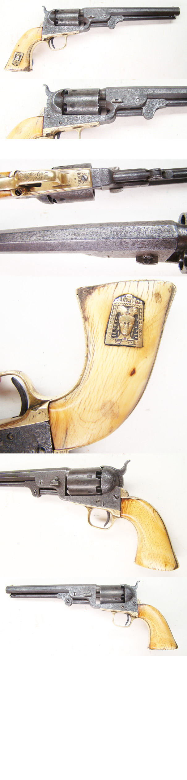 | Colt Model 1851 Percussion Revolver Factory Engraved 36 cal Bore VG, Mech Exc tight action, Original ivory Grips VG plus with right side having a brass inlay image of a chief I think. Has an original 7 1/2” Oct barrel with small brass sight and One line Hartford address marking mostly visible. The wedge is not numbered but appears as old as the gun. The frame has the serial#91893 matching Mfg’d 1860. The cylinder has faint markings the last 2 digits 93 of the serial number. The brass backstrap and trigger guard also have matching numbers and are engraved. The frame and barrel have scroll pattern engraving including the hammer and loading lever. The barrel and frame connection is excellent so the entire pistol is tight and mechanically excellent. Metal overall has a dark aged patina finish with some fine pitting . |