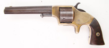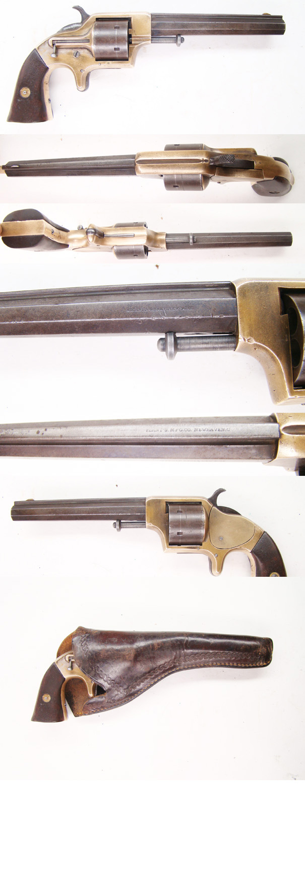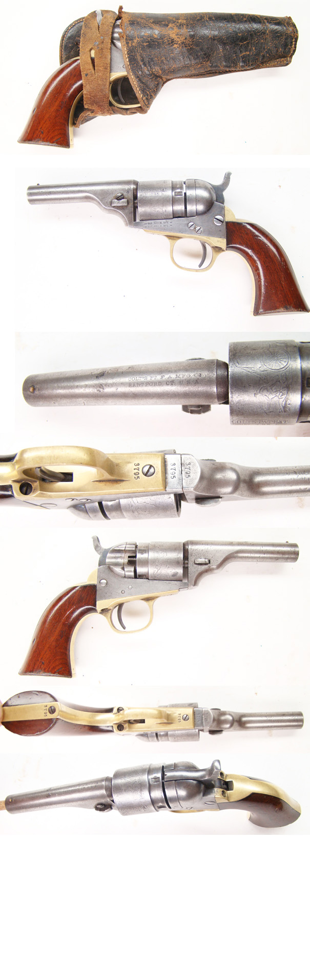 | Plant Large Frame 3rd Model Army cup primed 30 Cal, Bore near Exc, Mech VG, Original wood grips. Has a 6” Oct barrel with Plant Mfg Co New Haven Ct marked on top and on the left side is the Merwin and Bray New York marking they were the agents. The cylinder has excellent Patent markings ending in 1863. Has a brass frame with patina finish and the barrel and all metal parts are iron. Partial Serial#24 marked on the butt. Metal overall has a dark aged patina finish on the iron parts and brass frame also a few dings on the bbl edge under the left side markings trying to get the cylinder pin out . The brass has traces of original silver and under the grips is 75% original silver finish. Mfg’d 1863 Has ejector rod on right side. Also has a old form fitting holster included |