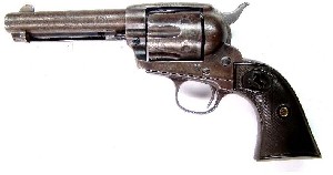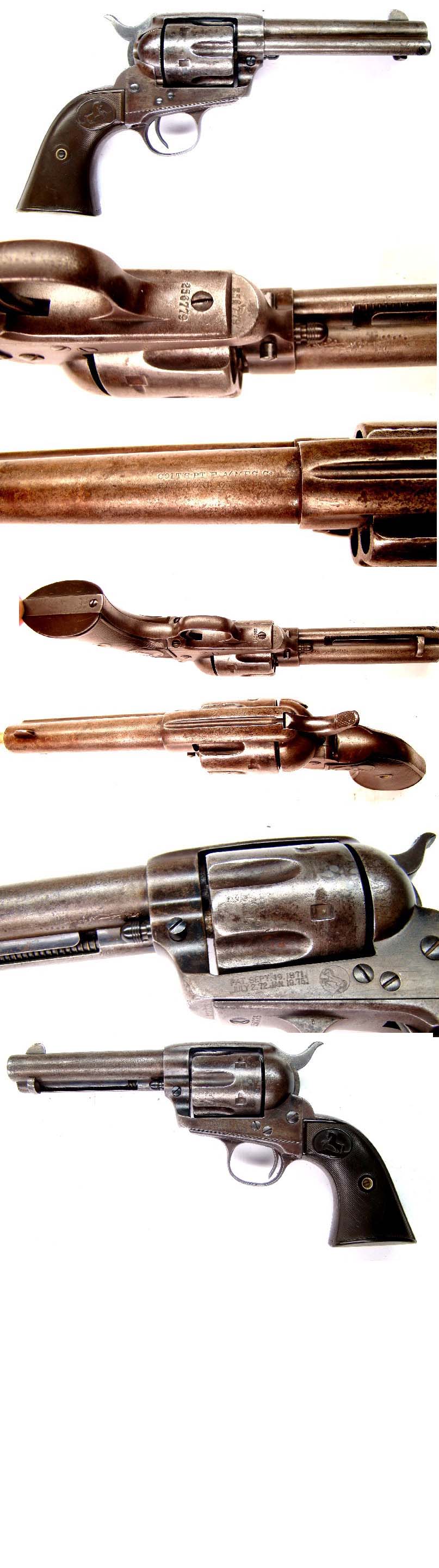 | Colt SAA 38-40 cal Bore VG strong rifling, Mech Exc tight and crisp action. Original Colt grips VG shows wear but no cracks ,chips or repairs. Has a 4 ¾” bbl with original front sight and VG 2 line address and 38 wcf on the left side of the bbl. The frame has excellent patent date markings. and horse in a circle. Serial# 256779 matching mfg’d 1905. Metal overall has an aged grey patina finish with traces of some fine pitting. All original and complete showing use but no abuse. Modern gun need FFL |
