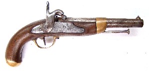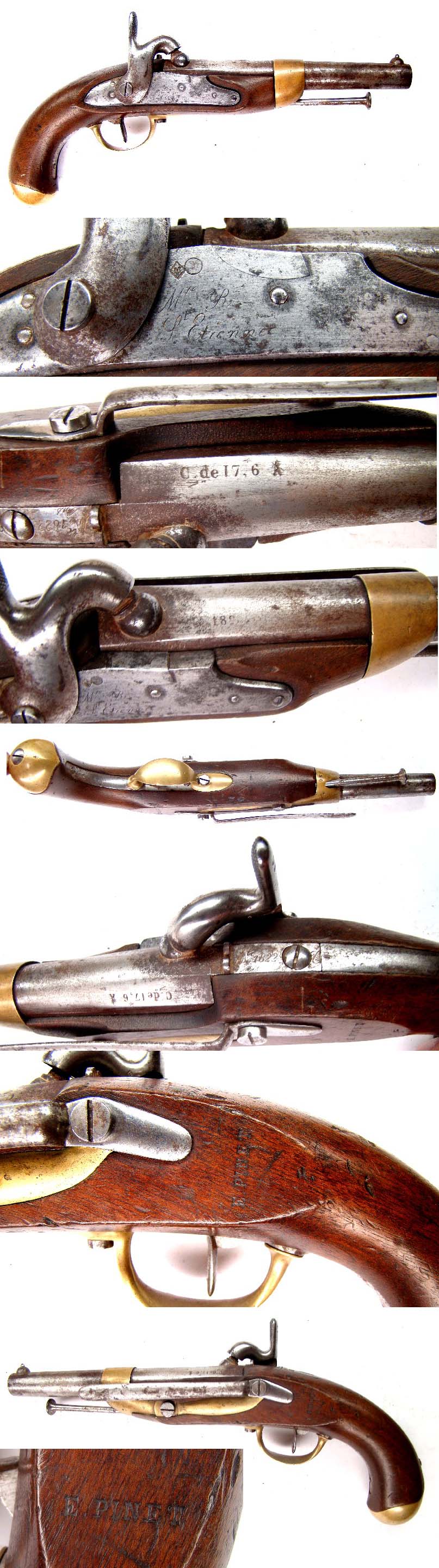| French Naval Percussion Pistol with belt hook conversion from flint 1822 dated Mech Exc, Wood is near Exc has a couple small dings. .Has a 72 cal rifled bore Exc ,8” long with original sights and marked 1822 in a couple places. The lockplate has markings M R and St Etienne. The left side has the belt hook. The wood is near exc with E.Pinet marked on the left side. There is a anchor marking on the brass buttcap and several other proofs. Has an original ramrod. Metal overall has an aged grey brown patina finish with traces of some very fine pitting mainly on the ramrod. The barrel ,endcap and wood are stamped 50 . |