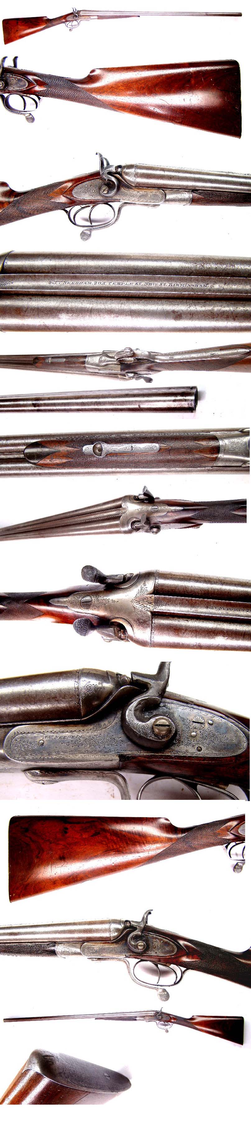 | J.V.Needham English Double Barrel Hammers, Under Lever English 10 ga Shotgun Bores Exc, Mech Exc tight and crisp actions, Wood is original excellent deluxe grain strong checkering ,does have a short hair line crack off the buttplate left side fades out 1 1/2”. Has original finely engraved overall metal parts and has case coloring on the receiver and bright case colors on the lockplates. Lockplates are marked J.V.Needham. Has a mismatched or repaired original hammer on the left side. Has 30” barrels with twist pattern .brass bead front sight and marked on the rib J.V Needham 20 A Temple St New St Birmingham Very clean and unabused English quality shotgun. |