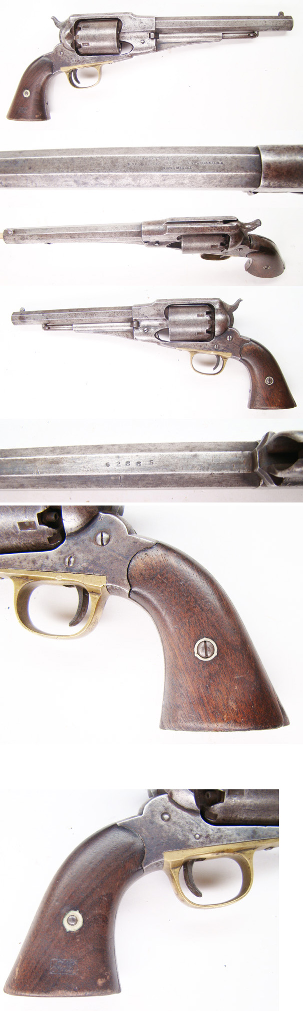 | Remington New Model 1858 Percussion Revolver 44 cal Bore Exc, Mech Exc tight crisp action, Has original wood grips with excellent cartouche on the right side. Has an original 8” Oct barrel with original front sight and has a VG mostly visible but weak in the center Remington address and New Model markings .Serial# 62885 Mfg’d 1863 puts it in the middle of the Government order which ended around 119,000. Has inspector initials in several places. Metal overall has an aged grey patina finish with traces of some very fine pitting. |