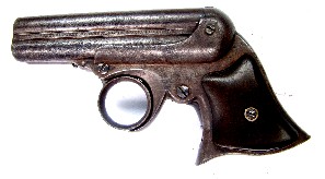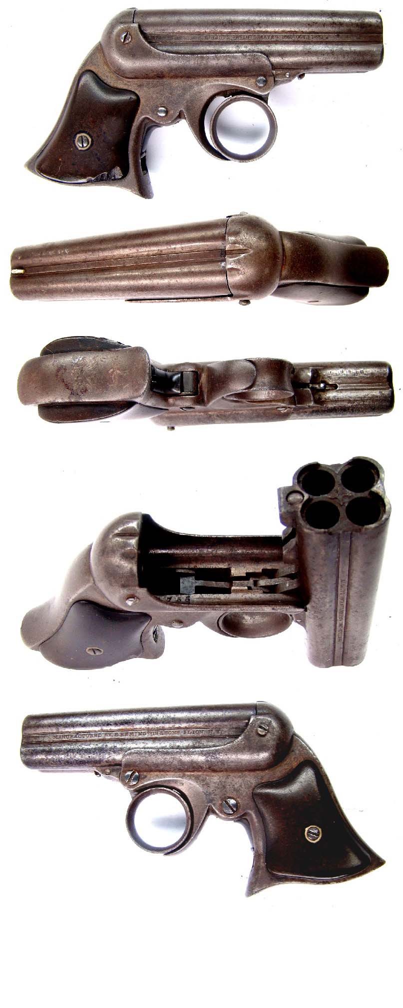| Remington – Elliot Deringer 32 cal Bores VG, Mech Exc works well. Grips VG has small chips on right side. Has original 3 3/8” barrel cluster. Remington Manufacture markings excellent on the left side and Elliots patent date markings on the right side flute. Serial#6755 Matching. Manufactured 1863 -1888. Metal overall has an aged grey brown patina finish with a little fine pitting on the right side lower barrel. |