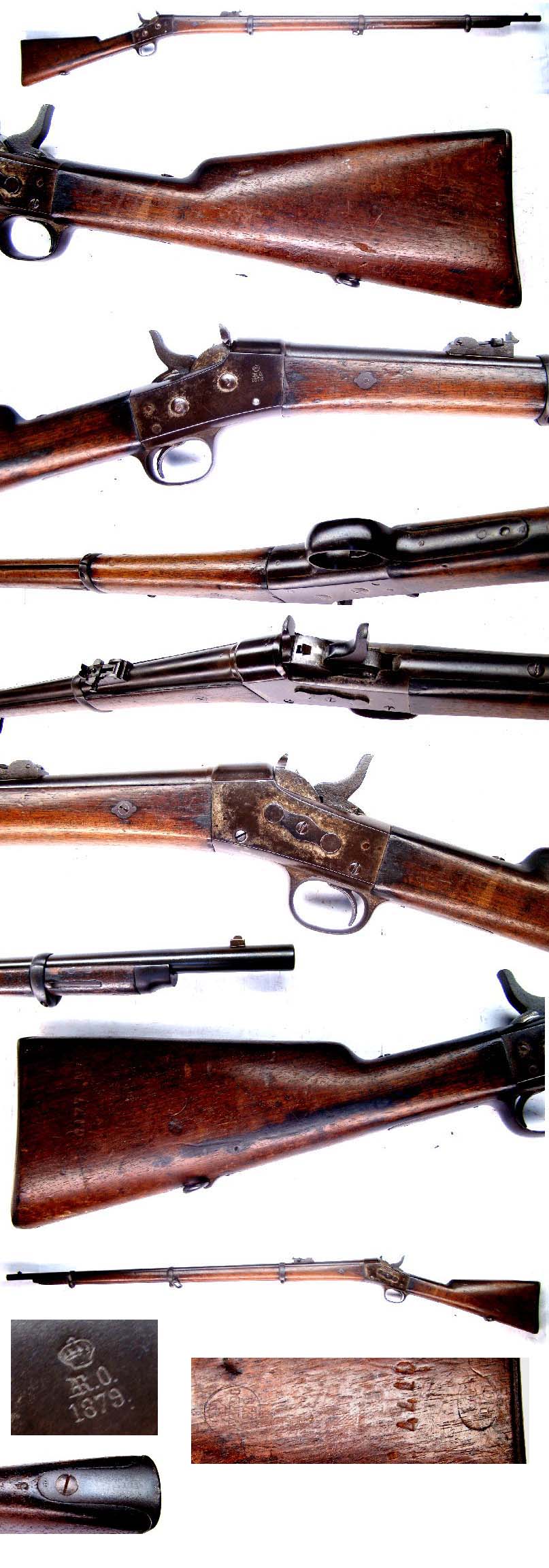 | Oviedo Spanish Rolling Block Rifle Model 1871 bbl marked ARO 1879,, 43 Reformado caliber conversion..Spain modified all guns in 1889 to use brass jacketed bullet. 43 Spanish can be used and will fireform into a straight case like the Reformado straight case...Bore Exc, Mech Exc, Wood Exc has 37” round barrel with original sights, barrel bands, sling swivels and barrage sight aligns with he left side of the rear sight and the side of the top barrel band. Metal overall has a dark blue finish with no pitting. Missing the ramrod. |