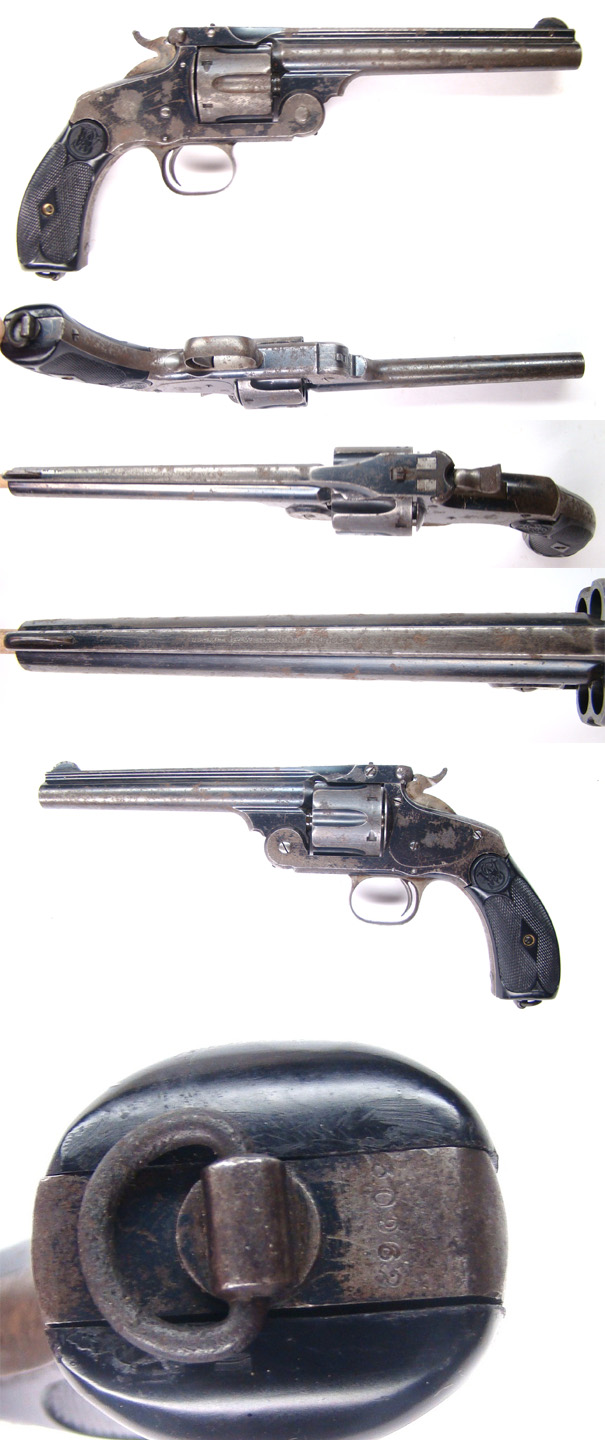 | Smith and Wesson New Model No 3 Single Action Revolver Mech Exc like new, 44 Russian cal, Bore Exc looks unfired, Original grips Exc, Has an original 6 ½” ribbed barrel with one line address Smith and Wesson Springfield Mass USA. The butt has the lanyard ring base and serial#30962 Cylinder number is 28505, Mfg’d 1897 All of these #3 new model frames were made before 1898 making them all antiques. Has 20% original bright blue finish and do to poor storage has several spots of surface rust. |